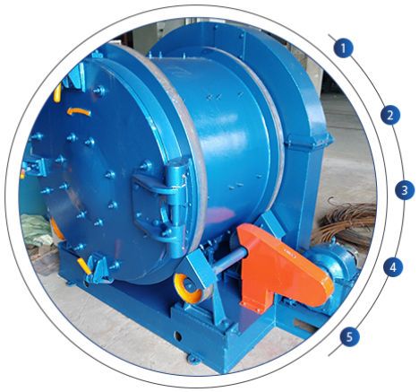 Dökme demirden yapılmış tambur tipi kumlama makinesi silindiri, koruyucu plakalı iç cıvatalar, iş parçasını işte döndürmek için plakanın bir ızgara deliği ve kılavuz kaburgaların spirali vardır. Ayrıca koruyucu ile tambur kabuğu arasında aşındırıcının geri kazanılması için bir spiral bant bulunmaktadır. Tüm makara sistemi, çerçevenin iki çift makarası üzerinde desteklenmekte olup, makara, zincir ve dişli ile tahrik edilen redüktörlü motor tarafından düşük hızda tahrik edilmektedir. Tambur hızı düşük olduğundan dökümde morluklar, kenarlar ve köşelerde aşınma daha az meydana gelir ve aşındırıcı yansımanın rolü nedeniyle dökümlerin ve dövme parçaların daha karmaşık şekillerini temizler. Uç kapağı tamburun bir ucunda bulunur, bu nedenle yükleme ve boşaltma uygundur ve koruma ve bakım işlerini değiştirmek uygundur.
